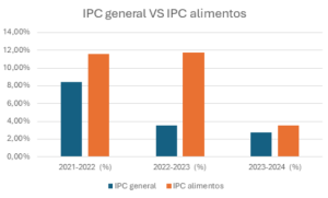 En una primera fase, el encarecimiento podía vincularse al aumento de los costes energéticos, de materias primas y transporte y otros bienes y servicios. Pero ya en ese momento, entre 2021 y 2022 los alimentos subieron más que el resto del IPC (11,6% vs 8,4%). Y, posteriormente, cuando el IPC general se frenó entre todos los sectores entre 2022 y 2023 hasta el 3,51%, la alimentación ha mantenido incrementos muy superiores (11,74%).